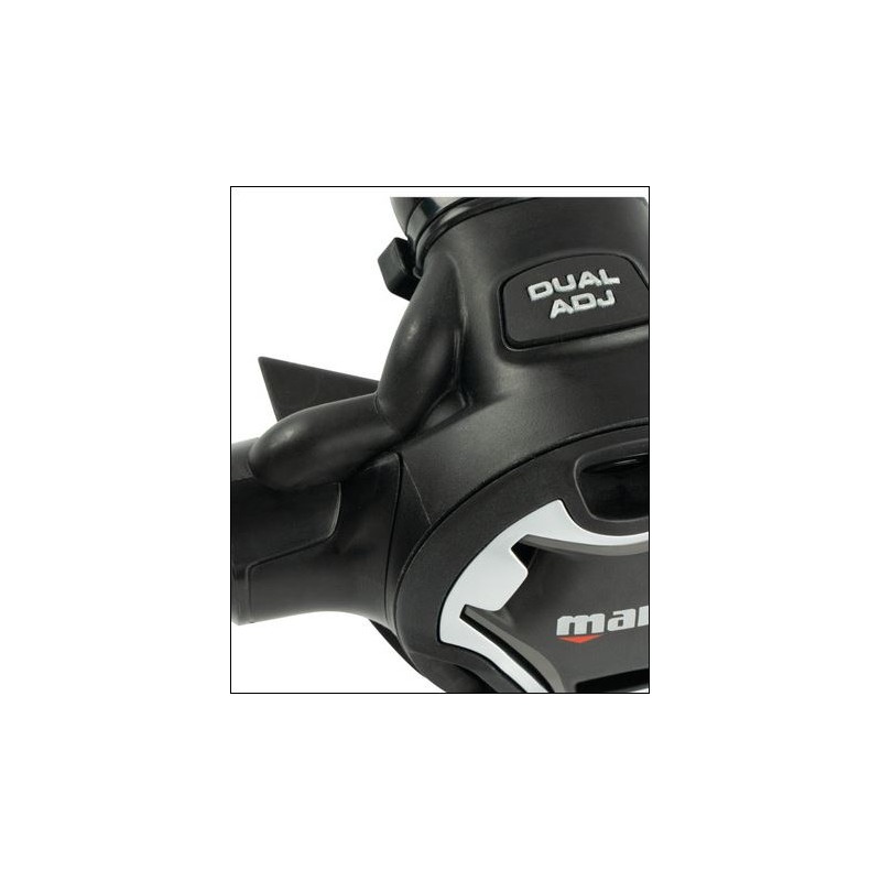 Le deuxième étage Dual Adj est fabriqué en technopolymère ultra léger et offre une respiration douce et facile à toutes les profondeurs. Il est doté d'une conception assistée pneumatique (P.A.D.) et des systèmes exclusifs Mares brevetés Vortex Assisted Design (VAD). Le nouveau bouton respiratoire réglable permet aux plongeurs de profiter d'une expérience respiratoire personnalisée, même lorsqu'ils portent des gants épais.