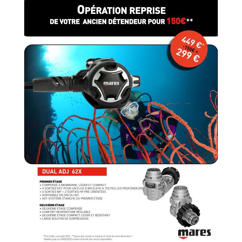 Fidèle à la marque Mares, le Dual Adj 62X dépasse les normes de performance à 200m et utilise une technologie éprouvée à 400m. Ce système de distribution hautement développé offre de hautes performances à un prix très compétitif tout en fournissant toutes les caractéristiques nécessaires aux plongeurs exigeants d'aujourd'hui. Équipé d'un tuyau superflex.